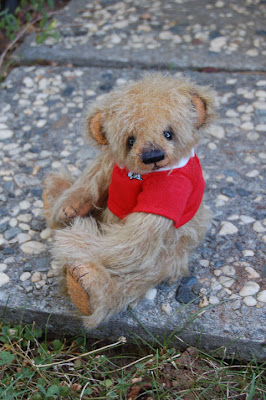 "HOWIE" is 10" tall and made out of a golden/tan mohair with black guardhairs throughout and a honey backing. German glass eyes in black. Black hand stitched nose. Fully jointed with armatures in his arms. Shaded and sculpted.